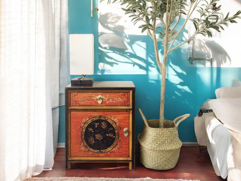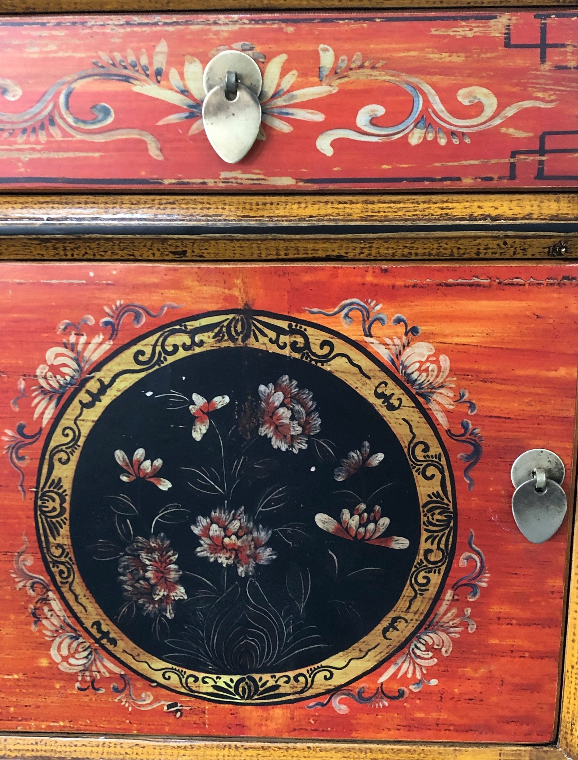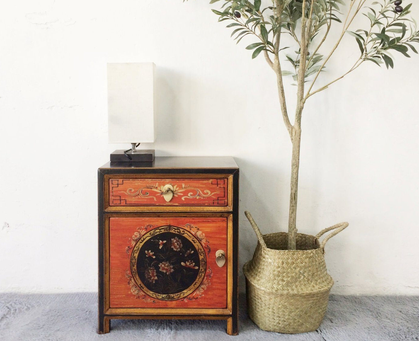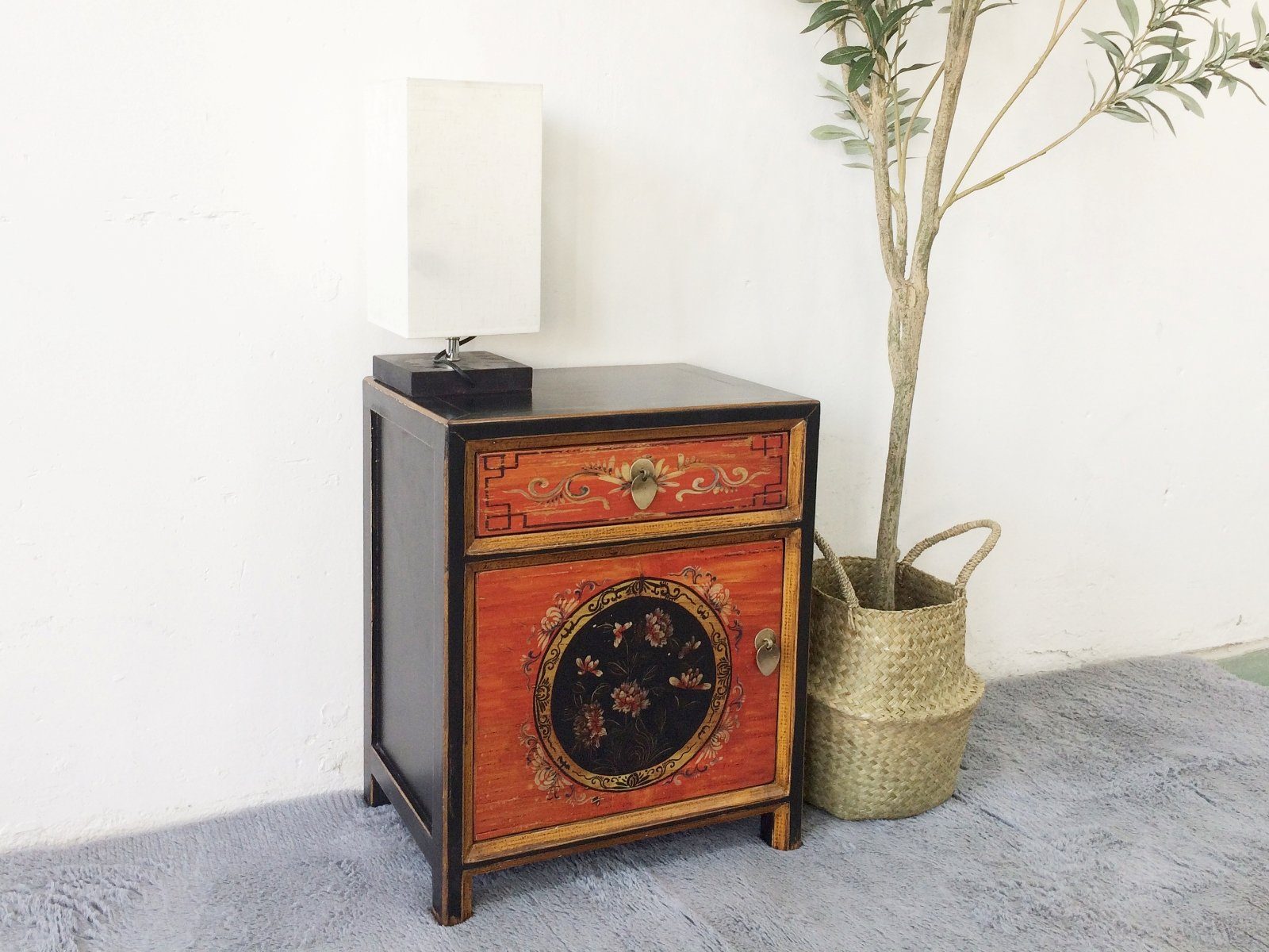 Hübscher chinesischer Nachttisch in exotischem Orange und Schwarz aus unserer Produktreihe "Coalflowers". Das Kästchen ist mit floralen Mustern und Ornamenten... Lesen Sie mehr