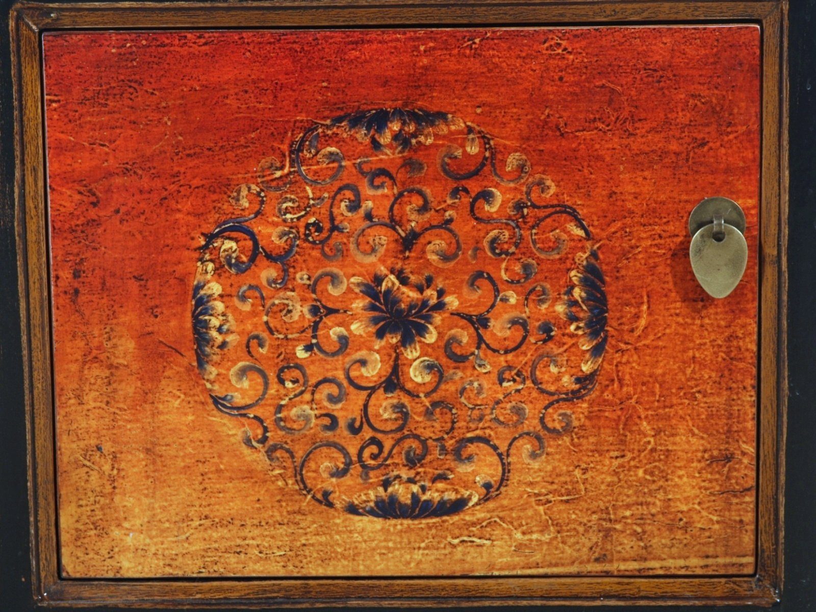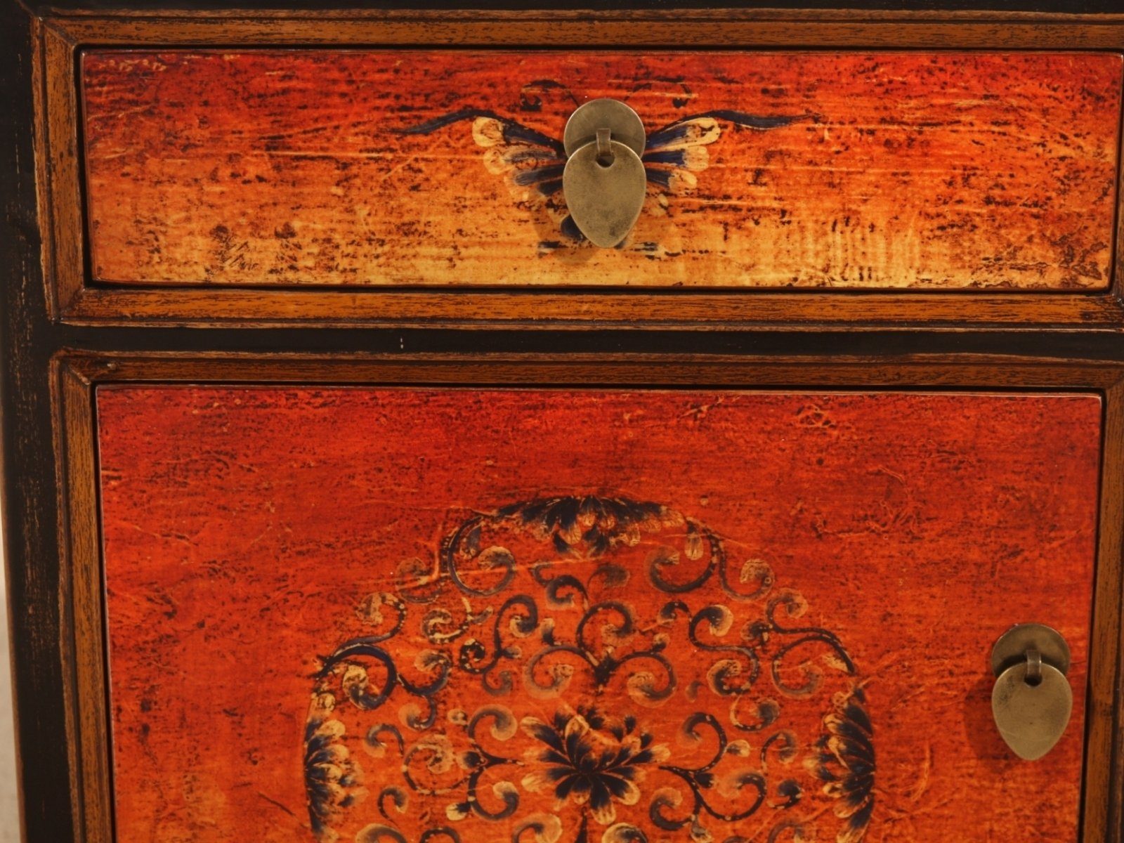 Hübscher chinesischer Nachttisch in feurigem Orange aus unserer Produktreihe "Fire". Das Kästchen ist mit floralen Mustern und Ornamenten verziert. Diese... Lesen Sie mehr