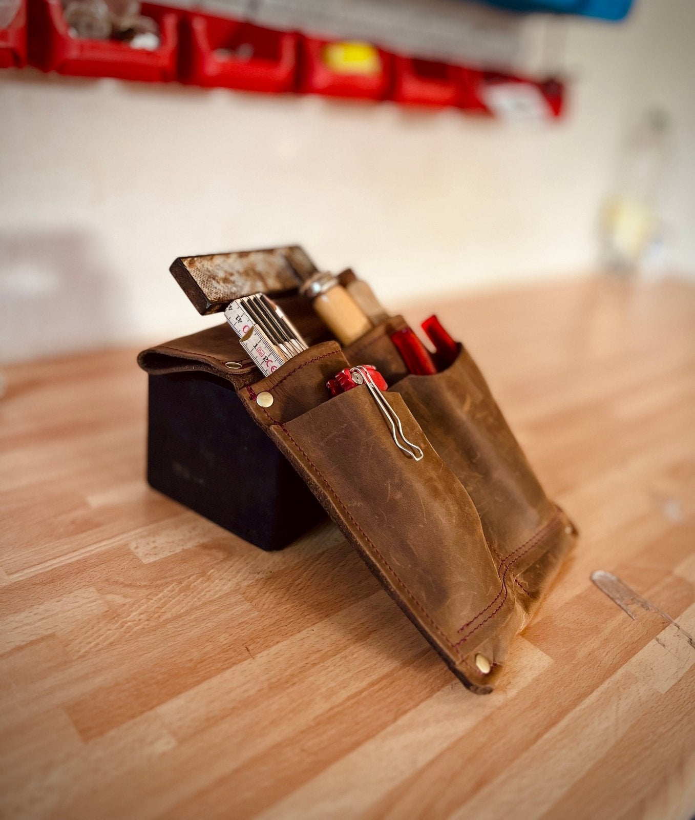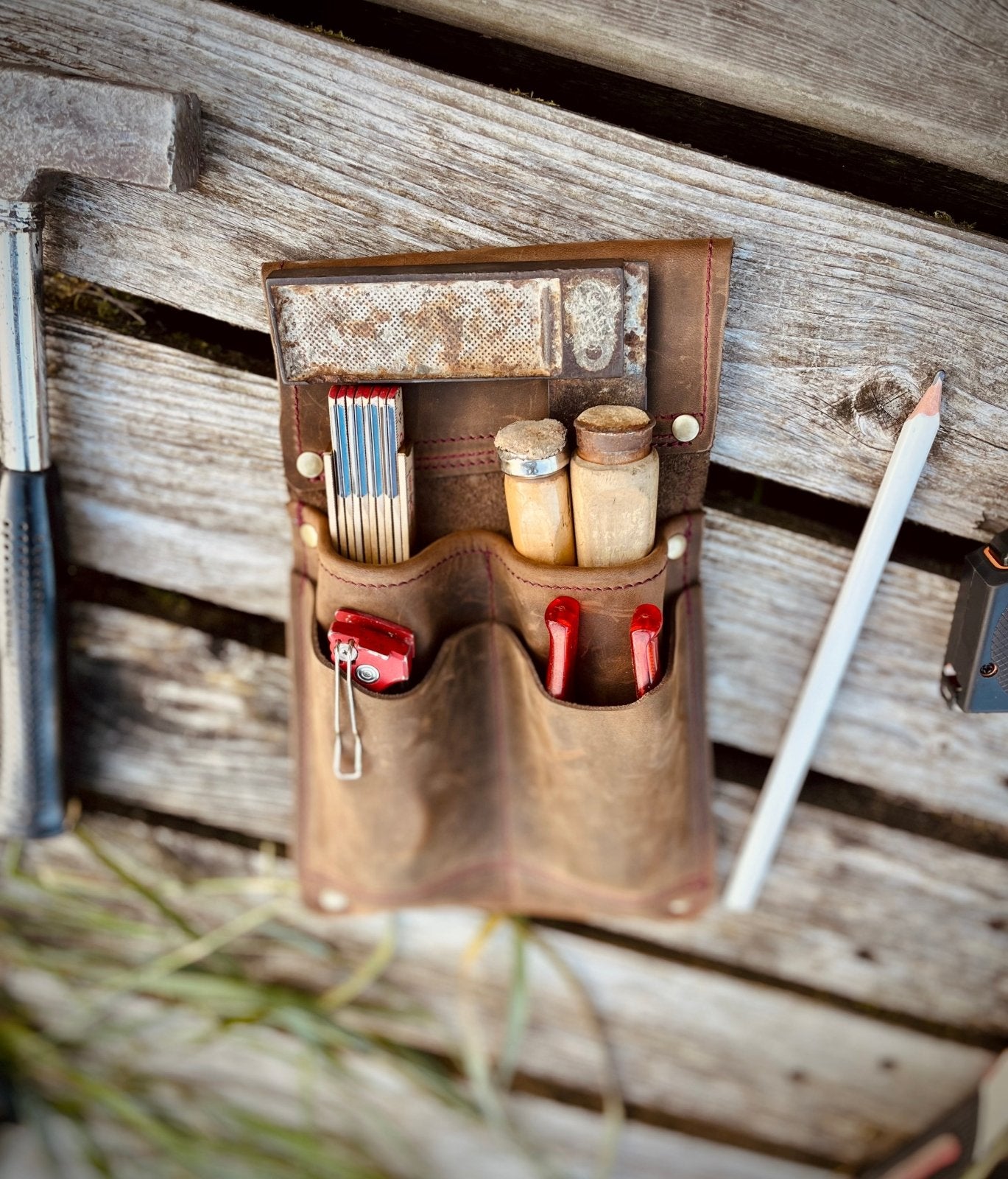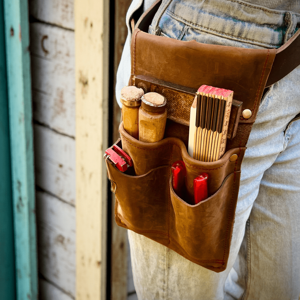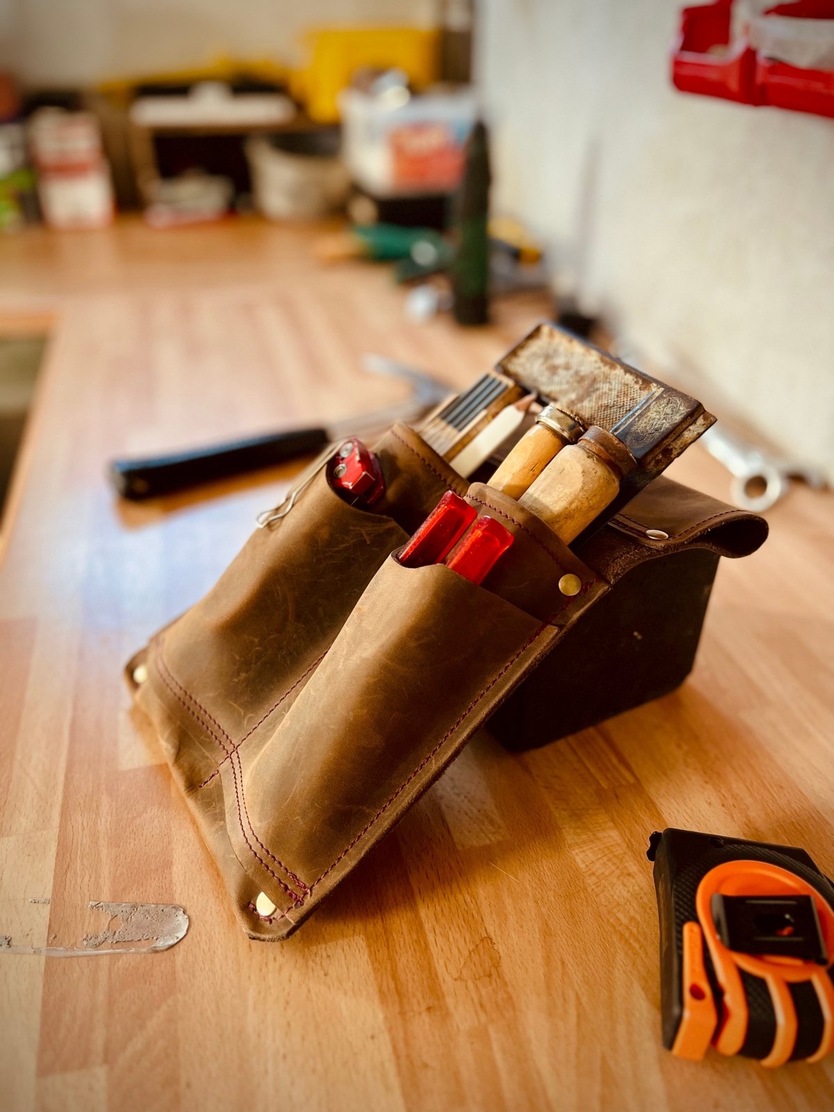Unser Werkzeuggürtel Set für die rechte Seite kombiniert den robusten Arbeitsgürtel aus gewachstem Leder mit dem Allround-Modul 1 Werkzeugtasche Leder– die ideale Lösung für Ordnung, Funktionalität und Stil.