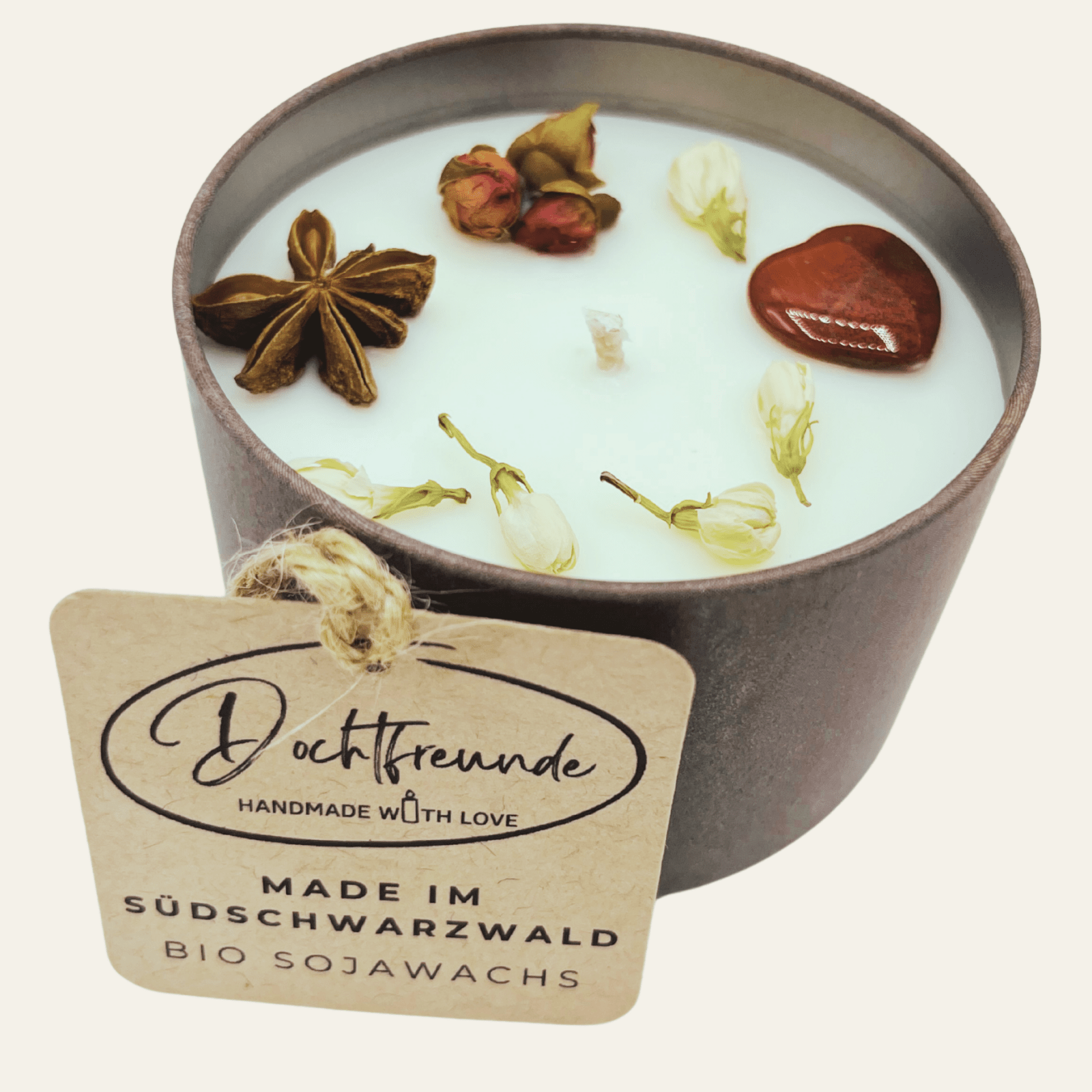 Jede Kerze ist ein Unikat, mit Liebe und handwerklichem Geschick gefertigt. Das natürliche Sojawachs sorgt für ein umweltfreundliches und sauberes Abbrennverhalten, während hochwertige ätherische Öle einen beruhigenden, langanhaltenden Duft verbreiten. Die elegante Metalldose macht sie zu einem stilvollen und langlebigen Geschenk, das Freude bereitet.