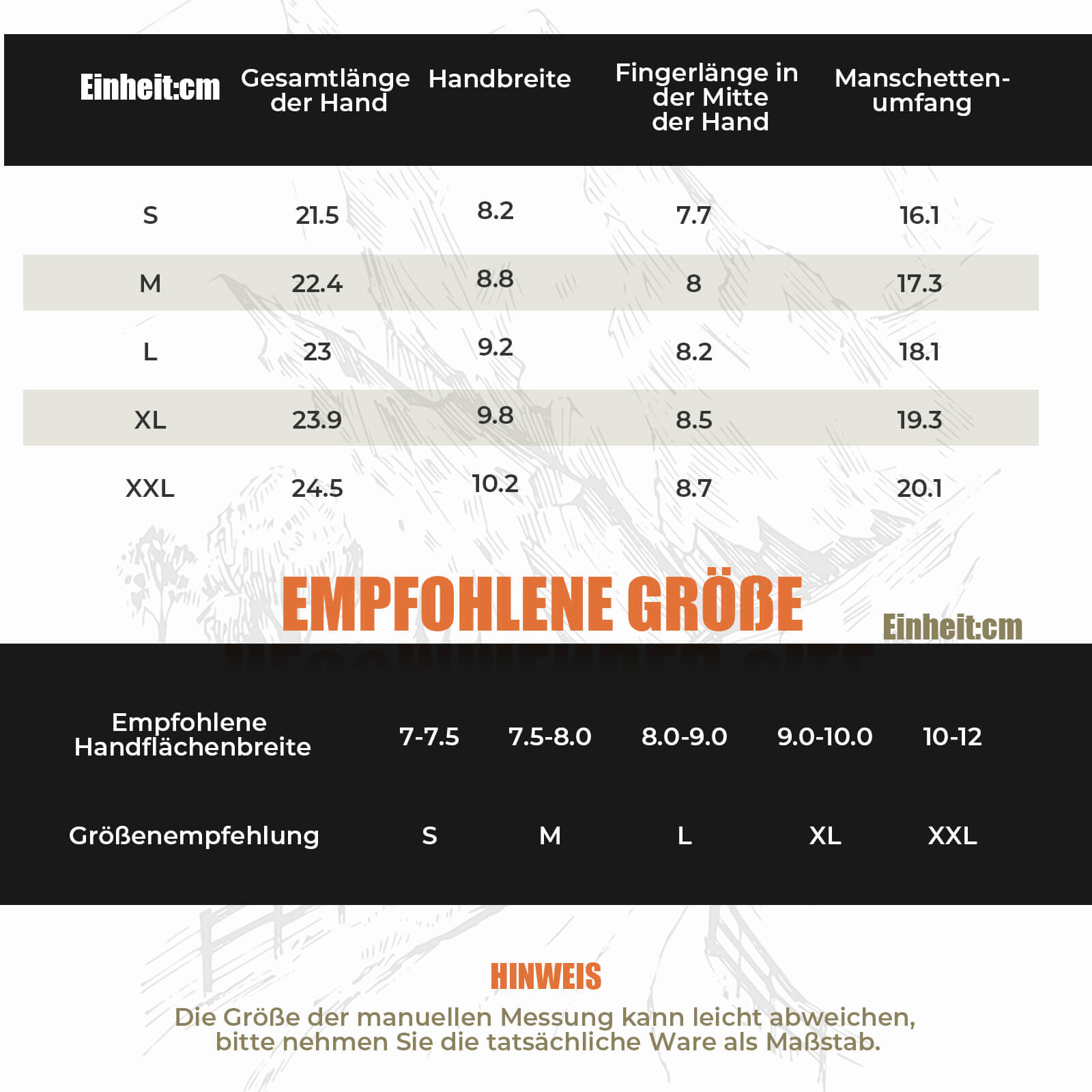 Handfläche: 55% Nylon + 45% PU Handrücken: 30% Polyester + 70% Spandex |