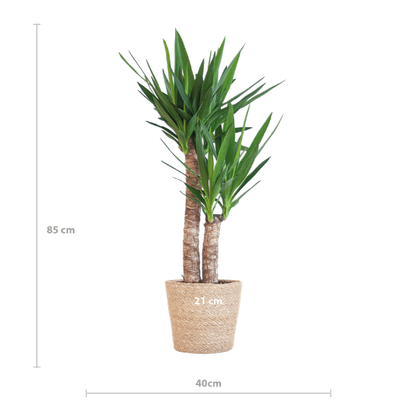 Geliefert wird die Yucca im Blumentopf Sofia aus geflochtenem Seegras mit Kunststoffeinsatz, der das Einweichen verhindert. Die beige Farbe des Korbes harmoniert perfekt mit dem satten Grün der Pflanze und verleiht Ihrem Interieur einen natürlichen, eleganten Look.