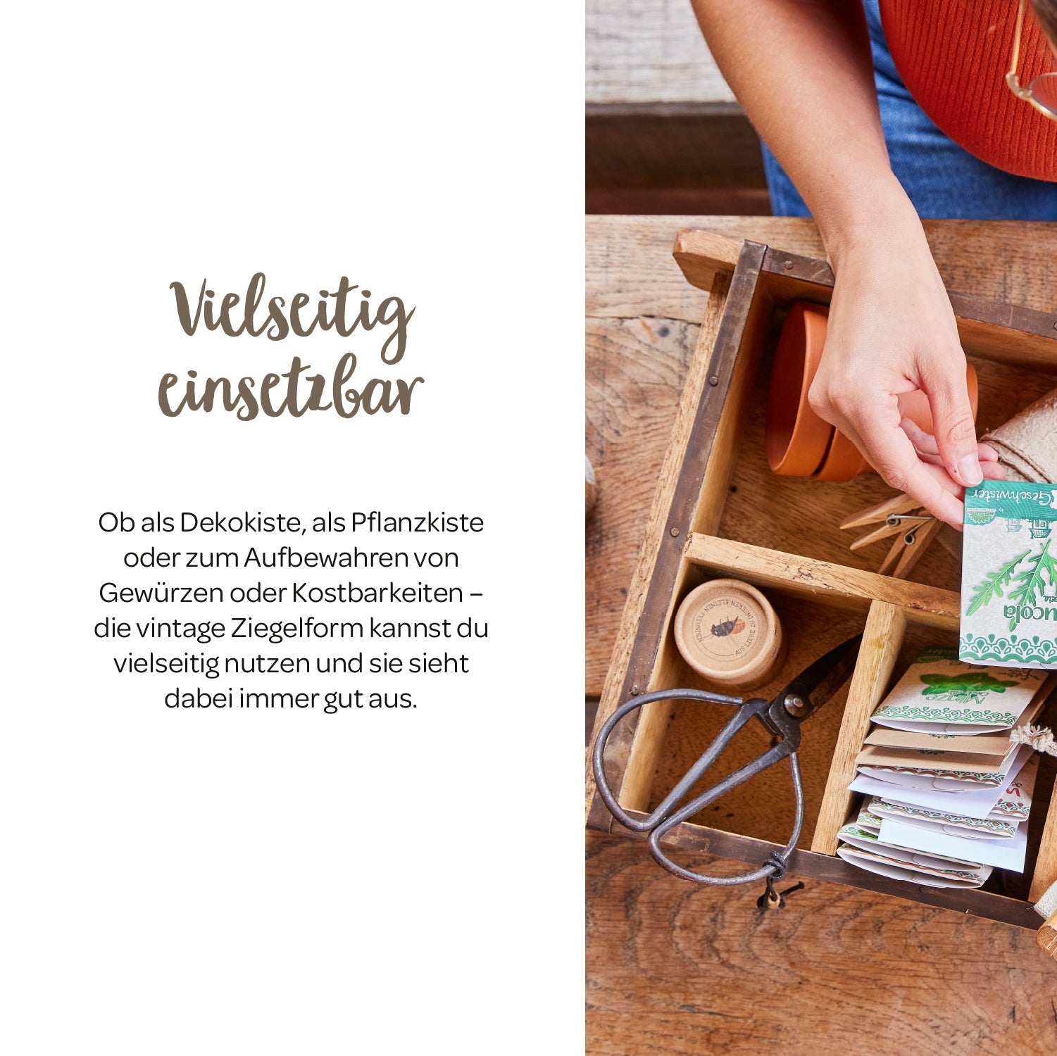 Vielseitig einsetzbar: Ob als Dekokiste, als Pflanzkiste oder zum Aufbewahren von Gewürzen oder Kostbarkeiten - die vintage Ziegelform mit vier... Lesen Sie mehr